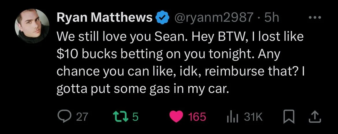 If you still keeping talley, we went 9/15 on the night. If you tailed the prize picks play I’m sorry that crashed the first fight of the night. Probably should’ve bet on boxing.